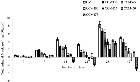 3.5. Regression Analysis Between Total Mineral N Released over the 42 Days and Compositional Makeup of the CM and CCM Produced at Different Temperatures