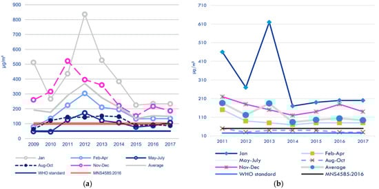 Average concentration of (a) PM10 in air for the period 2009–2017 and (b) PM2.5 for the period 2011–2017 in Ulaanbaatar for different seasons [9].