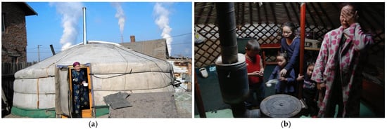 During the winter season, especially in the ger areas of Ulaanbaatar, when temperatures are −20 °C or less, the use of coal and wood fuels for heating increases rapidly and the air pollution is aggravated [10]. Households in the ger areas, named so for the traditional felt tents many live in, account for a considerable proportion of air pollutant emissions of the whole city owing to coal usage for heating [11]. Since most of the gers are not connected to the central heating system, they use a coal-burning stove (Figure 2).