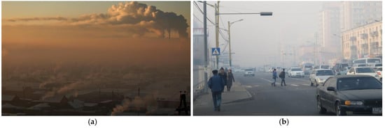 In Mongolia, more than 70% of the population lives in urban areas, and as of 2015, approximately 1.37 million people live in Ulaanbaatar [18]. Recent statistics estimate that there are 800,000 residents in the ger areas comprising 60% of Ulaanbaatar’s total population [19]. Owing to the fast urbanization rate in Ulaanbaatar, the poor live in gers in the city and use wood, coal, and even garbage as fuel for their cooking and heating. In the city, a large amount of combustion exhaust and particulate matter from the coal-fired thermal power plants also contribute to the severe air pollution (Figure 3a). This results in Ulaanbaatar being covered with smog throughout the winter (Figure 3b). Especially at night, when the temperature falls to −30 °C and temperature inversion occurs during the long and cold winter season from mid-October to April, pollutants stagnate in the city for a long time and the air pollution levels are more than 10 times the national environmental standards. Thus, in winter, the citizens suffer from respiratory diseases such as pneumonia, bronchitis, asthma, and emphysema.
