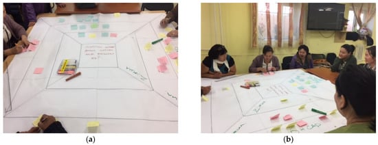 The workshop was conducted on 9 March 2017, in the conference room of the 7th sub-district of the Songino Khairkhan District. Songino Khairkhan District is evaluated as the most polluted area in Ulaanbaatar according to the air quality monitoring system. The first author of this paper facilitated the workshop in Mongolian, and a staff member from PCC translated between Mongolian and English for him and the participants when communication difficulties occurred. Refreshments were provided to the participants to encourage them to speak in an informal atmosphere. Twenty residents of the district voluntarily attended the workshop and participated in the discussion for three hours. Utilizing the Yonmenkaigi system method (YSM), participants identified current issues and perspectives concerning air-quality risk management in Ulaanbaatar and expressed their needs and desired situations. The YSM is a participatory method to support group decision making, which fosters small and modest breakthroughs and/or innovative strategy development [31]. The YSM has found wider acceptance in terms of both the number of study areas and subjects of application. For example, the method has been applied to both rural and urban areas in Japan as well as in Korea, China, and Indonesia [31].
