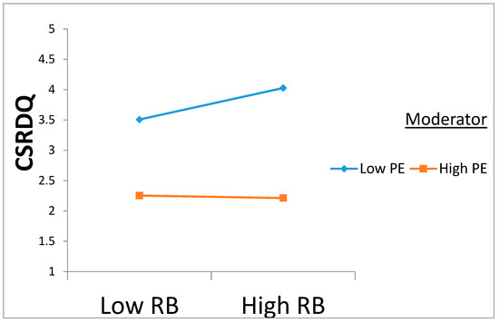 Interaction moderation (PE dampens the positive relationship between RB and CSRDQ).