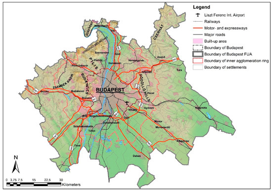 The study area covered the FUA of Budapest, which comprises 6077 km2 with 186 municipalities. It is the home of ca. 3 million people (1.7 million residing in Budapest). The 80 municipalities adjacent to Budapest constitute the inner ring of the metropolitan region, which is in an advanced stage of physical and functional fusion with the city, and hence it is also recognized legally as the Budapest Agglomeration. The rest of the municipalities in this study belong to the outer fringe of the wider metropolitan region (Figure 1).