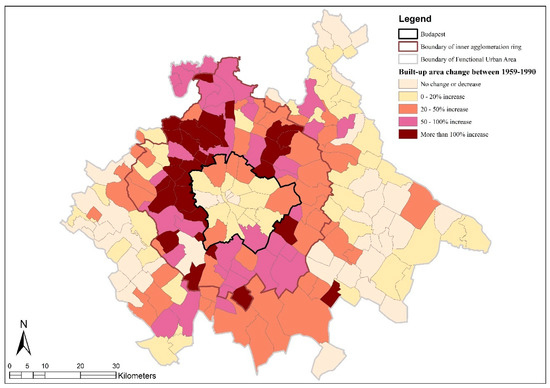 In the state socialist period (1959–1990), the rapid growth of population, both in the core city and the inner agglomeration, was decisive. Population growth in the inner agglomeration was also fostered by legal regulations prohibiting the free movement of people to the territory of Budapest after 1958. The growth in residential areas was the fastest in the eastern and southeastern sectors of the study area. The situation was similar for the economy, because industrial developments were banned in Budapest and 44 surrounding settlements after 1959. Despite this fact, industrial developments led to large-scale conversions that could not be controlled by bureaucratic measures or by favoring and supporting the industrialization of rural areas. Since possible sites of industrial expansion in Budapest were essentially exhausted by the 1960s, industrial development was increasingly taking place in the surrounding suburban settlements [71]. In the 1970s and 1980s, immigration to the urban region from the countryside gradually declined, and the tempo of industrial and economic development slowed down compared to the previous decades, which led to lower levels of land conversion.
