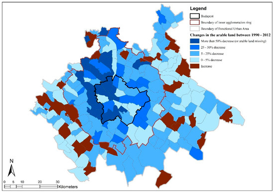 While the share of agricultural area converted to artificial areas remained the same (86%), some shifts between the different categories could be observed (Table 2). The contribution of arable land increased, whereas the share of vineyards significantly decreased. The ratio of complex cultivation patterns also increased (by 13%), which indicates the rapid transition of the formerly loosely populated outskirts and scattered farm areas. However, the largest loss (of 22,400 ha) was recorded in the arable land category (Figure 3), while the area of complex surfaces shrank by 7700 ha. The share of orchards and pastures also decreased by ca. 5%; nevertheless, the extent of pastures grew by 9500 ha.