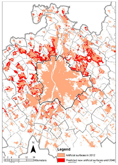 The main directions of the forecasted changes for the 2012–2040 period were in line with the trends of the postsocialist era, which was partially a consequence of the described modeling methodology. Our results indicated a further increase in artificial surfaces by 22.8 thousand ha by 2040. This means an average yearly conversion rate of 814 ha, which falls below the calculated growth rates of the postsocialist periods. These results can be understood as the interplay of further sprawl and the consequences of the “Act on Spatial Planning in the Agglomeration of Budapest (2005)”, which introduced planning constraints to control urban sprawl. According to our projections, the newly developed built-up areas will be located close to the already existing artificial surfaces. The conversion of the currently loosely populated complex agricultural areas (with mixed agricultural, economic, and demographic functions) into densely built-up areas is also predicted. The remaining open arable land in the growth axes of the agglomeration ring will also disappear, and thus an accelerated physical merging (conurbation) of the inner ring of the agglomeration is foreseen (Figure 4). This process has been acknowledged (and thus not hindered administratively) by planning documents such as the recently prepared “Structural Plan of the Budapest Agglomeration” [70].
