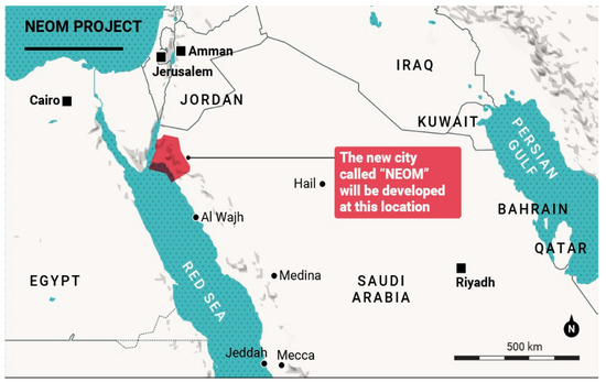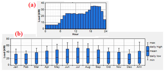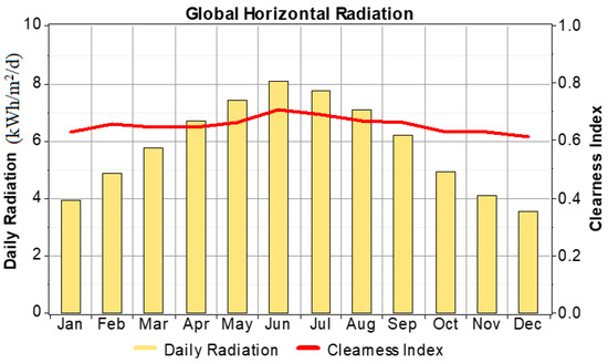 A small community in the city of NEOM (Saudi Arabia) was chosen as a case study. It is situated at the latitude of 29° N and longitude of 35° E, as shown in Figure 1. NEOM is located far away from the nearest utility grid connection point. The location of NEOM is characterized by a high average level of solar irradiance. The average daily horizontal solar radiation is around 5.85 kWh/m2. The mean daily solar radiation and clearance index during the year are shown in Figure 2 [33]. The highest daily irradiance value of 8.085 kWh/m2/d is collected in June. Whereas, the least daily irradiance of 3.542 kWh/m2/d is received in December. Figure 3 displays the profile of load demand. The daily load demand is 500 kWh, with a peak of 35 kW. The average peak and load factors are 20.8 kW and 0.296 respectively.