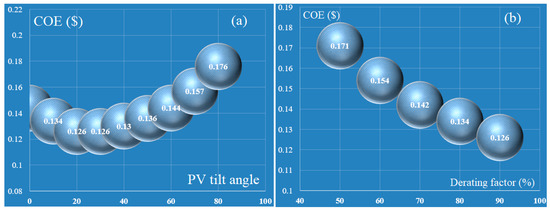 In this study, the effects of the variation of the derating factor and PV tilt angle on the cost of energy were considered. The PV derating factor represents a scaling factor that applies to PV system power output to account for reduced output in practical case compared to the conditions under which the PV panel was rated. Such factor is employed for accounting soiling of PV modules, wiring losses, partial shading, aging, and so on. Therefore, it is very important to study the effect of the derating factor on the cost of energy.