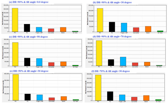 The effects of varying the tilt angle of the PV array and the derating factor on the cost of energy are shown in Figure 4. It can be concluded that maximum and minimum COE values were 0.176 $/kWh and 0.126 $/kWh, respectively, for 80 degrees and 30 degrees. Also, the COE decreased from 0.171 $/kWh to 0.126 $/kWh with increasing the derating factor, as shown in Figure 4b. Table 2 displays the detailed related costs of different components of the PV/FC/B system with a varying tilt angle of the PV array and derating factor. The total NPC for different system components is shown in Figure 5.