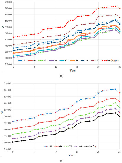 The discounted cash flows related to the PV/FC/B system with varying tilt angles of the PV array and derating factor are demonstrated in Figure 6. As illustrated in Figure 6a, the lowermost capital cost was attained with a tilt angle of 30 degrees thanks to the small required number of PV panels. The capital cost values were $380,200, $341,800, and $468,500, respectively, for horizontal, 50 degrees, and 80 degrees of declination. The total NPC of PV/FC/B decreased sharply from $677,895 to $500,823 with increasing the derating factor, as illustrated in Figure 6b.