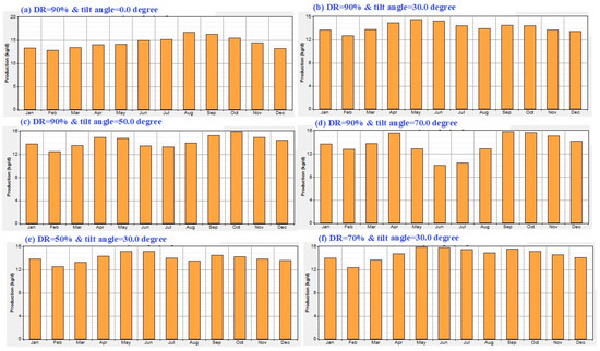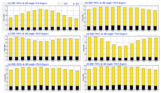 The rated capacities of the PV system were 280 kW, 200 kW, and 240 kW respectively for horizontal, 30 degrees, and 50 degrees of declination of PV array. Consequently, the average daily PV generated power were 58 kW, 45 kW, and 51 kW, respectively, for horizontal, 30 degrees, and 50 degrees of declination of PV array. The average daily generated power by PV for every month with varying the tilt angle of PV array and the derating factor is shown in Figure 7. While for the FC, the average daily FC generated power were 25.9 kW, 27.3 kW, and 27.9 kW, respectively, horizontal, 30 degrees, and 50 degrees of declination of PV array. For the optimal case, May and June had the maximum rate of energy production by FC.