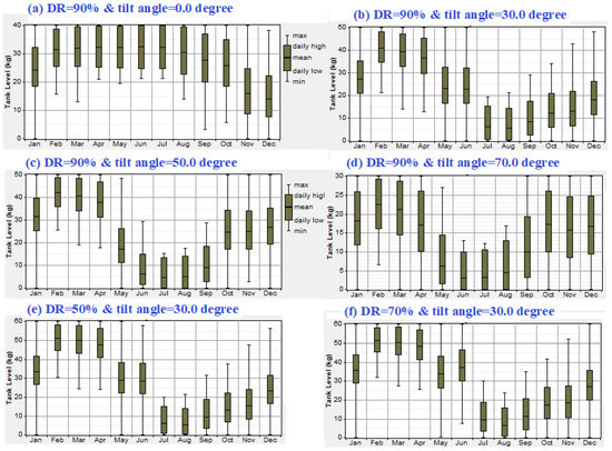 The mean produced hydrogen per month is presented in Figure 8. The annually produced hydrogen were 5300 kg, 5188 kg, and 5203 kg, respectively, for horizontal, 30 degrees, and 50 degrees of declination of PV array. The minimum levelized cost of hydrogen was $4.38/kg. It was achieved with the optimal case with a PV tilt angle of 30 degrees. The statistics of hydrogen tank per month are shown in Figure 9.