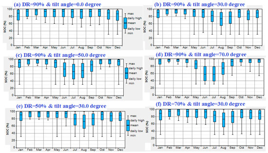 The nominal capacities of the battery were 138 kWh and 207 kWh respectively for horizontal and 30 degrees of declination of PV array. The values of the expected life of the battery were 4.9 years, 5.28 years, and 5.11 years respectively, for horizontal, 30 degrees, and 50 degrees of declination of PV array. The monthly statistics of battery SOC (Stat of charge) are shown in Figure 10.