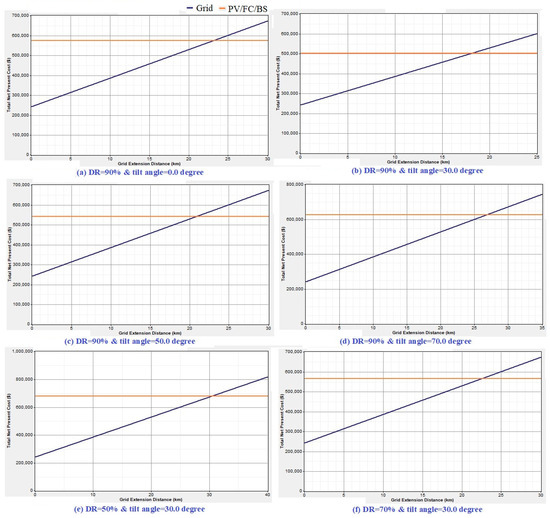 To prove the viability of the PV/FC/B system, a comparison with a utility grid (UG) extension along with a diesel system has been done. The initial cost of a grid connection and yearly maintenance cost were $10,000/km and $200/year/km, respectively. The energy consumption tariff, according to the Saudi Electricity Company, was $0.06/kWh [48]. Figure 11 illustrates a comparison among the NPC of PV/FC/B with different conditions and NPC of the grid. The UG extension is more cost-effective than stand-alone systems for sites when the distance between UG and stand-alone systems is smaller than break-even grid extension distance (BGED). BGED is the distance from the grid that makes the total NPC of extending UG equal to the NPC of the stand-alone system. Figure 10 demonstrates that the PV/FC/B system is better than the utility extension up to a distance of 30 km. This confirmed that a PV/FC/B system is suitable for NEOM, which is located far away from the nearest point of the grid.