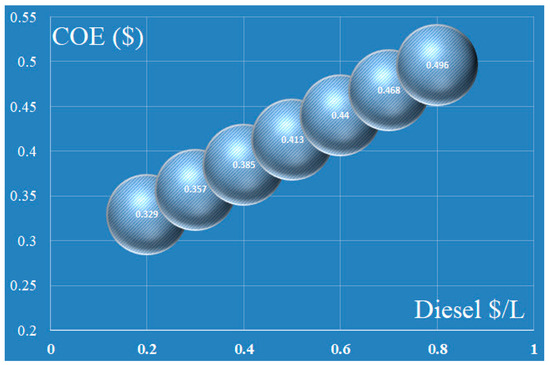 The initial and replacement cost of the diesel generator (DG) was assumed to be $230/kW. In contrast, the operation and maintenance cost was considered to be $0.1/h based on an operation lifetime of 15,000 h [49]. The diesel price in Saudi Arabia was $0.4/l. However, this value can be increased in remote regions because of the high transport fee. The optimization results confirmed that the best size of the diesel generator was 50 kW based on the diesel price of 0.4 $/l. The COE and NPC for the DG were only $0.385/kWh and $154,1572, respectively. Figure 12 displays the influence of diesel price on both COE and total NPC. One can see that both NPC and COE considerably increased with increasing diesel prices where COE varied from $0.329/kWh to $0.496/kWh, and NPC varied from $1,319,032 to $1,986,653 with the growth of diesel price from 0.2$/L to 0.8$/L. This means that using PV/FC/B would decrease energy costs by around 67.3% and save more than one million dollars. Also, the PV/FC/B system could significantly reduce greenhouse gas emissions, particularly carbon dioxide (CO2). The yearly avoided CO2 would be approximately 133,047 kg.