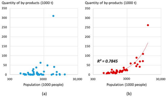 Correlation between the quantity of by-products and the population in each area in Japan. (a) By-products from upstream, and (b) from downstream of the seafood supply chain. Quantity of by-products in each area was obtained from the previous study [22], and the population data were from statistics of the Japanese government [32].