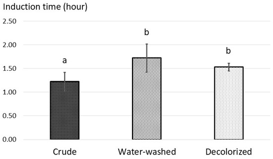 To clarify the effect of the refinement process on oil stability, we compared the oxidative stability of crude oil, water-washed oil, and decolorized oil at 100 °C. Oxidative stability was significantly higher after the deoxidization and water-wash process. The decolorized process did not affect stability (Figure 2).