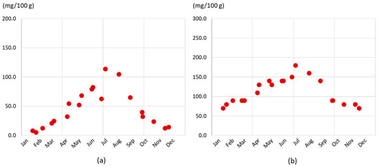 Histamine and volatile basic nitrogen (VBN) are indicators of the freshness of raw materials to FM. Although the contents of histamine and VBN in FM from UFB were relatively high compared to anchoveta, it is noteworthy that the standard deviations were large (Table 5). Seasonal changes in these indicators are shown in Figure 3. Except for the hot season of Japan (July–September), less than 100 mg/100 g of histamine and 150 mg/100 g of VBN were detected in almost all samples produced in two years.