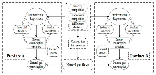 In summary, the following three objectives can be derived from the above literature: first, determining how environmental regulation affects regional gas consumption by focusing on the change in the energy structure; second, focusing on regional heterogeneity and exploring how the evolution of environmental regulation law has promoted gas consumption; and third, revealing the mechanism of environmental regulation competition based on the gas resource flow. Therefore, this paper will be focused on these three issues: (a) how environmental regulation promotes the growth of natural gas consumption through energy substitution, (b) the conduction path of the spatial spillover effect of the regulation and (c) the impact of local governments’ choice of regulation on the allocation path of the natural gas market under a decentralized system. For the abovementioned reasons, the hypothesis of the impact mechanism of environmental regulation on natural gas consumption in China is proposed in this paper, as shown in Figure 1.
