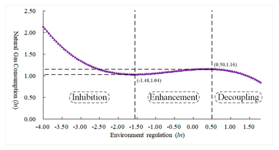 The government levies a pollution tax (fee) on polluting enterprises to force them to change their production methods and adopt cleaner energy and production technologies. However, this kind of replacement often requires relatively high costs. Therefore, many Chinese industrial enterprises often follow the pollution control mode of “pollution first, treatment later” and use environmental protection investment to treat pollutants. It is difficult to achieve the cleanness of energy inputs [37]. In Table 1, the coefficient ln(ER*Ind*ECS) in Model Ⅴ is significantly negative, thus not only confirming the above conclusion but also showing that this “pollution first, treatment later” environmental treatment will also significantly negatively affect natural gas consumption. This negative effect on natural gas consumption is because levying sewage taxes focuses only on the results and does not control the generation of pollutants from the input of energy production. Therefore, a variety of environmental regulation policies are needed to act on all links of the industrial chain and jointly promote cleaner production activities.