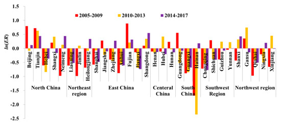 The first, square and cubic term of lnER are gradually added into Equation (1) to formulate Models I–III as shown in the second to fourth columns of Table 1. The table shows that the coefficients of the regulation intensity in Model Ⅲ are significant compared with those in Models Ⅰ and Ⅱ, and even the first coefficient is negative, the second is positive and the third is negative, thus indicating that there is an inverted “N” curve between the gas consumption volume and the regulation intensity (depicted in Figure 2); there are two inflection points: −1.48 and 0.50. As Figure 2 shows, regulation enhances gas consumption if the lnER is in the range of −1.48–0.50; otherwise, regulation reduces the gas volume within regions, thus resulting in a “green paradox”. Further, in Figure 3, the averages of the intensities during three periods—2005–2009, 2010–2013 and 2014–2017—show the intensity changes in each province in China from 2015 to 2017, and the lnER of most provinces are in the range of −1.48–0.5, thus indicating that under the pressure of environmental assessment by the central government, local governments have the demand to increase gas consumption. However, the intensity of regulation varies greatly among the provinces, and the five provinces of Beijing, Tianjin, Fujian, Shanxi and Shandong, especially, have been maintaining high regulation because the lnER of these provinces are greater than zero, while other provinces in China maintain low regulation. Additionally, the difference is that the provinces with high intensity tend to gradually weaken in intensity, while those with low intensity tend to strengthen in intensity. Therefore, the changes and differences among the provinces indirectly indicate the difficulty of local governments in balancing and choosing between environmental quality improvement and economic development.
