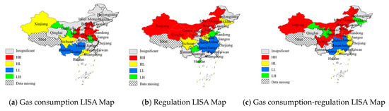Furthermore, the spatial structure of gas consumption agglomeration in China is dominated by the spatial correlation of environmental regulation (as shown in Figure 4), especially in regions with insignificant spatial correlation in Inner Mongolia, Hubei, Jiangxi, Zhejiang, Fujian and other provinces. Under the effect of environmental regulation, these provinces show significant spatial positive correlation compared with that shown in Figure 4a. Concretely, the area with an HH agglomeration is mainly in Xinjiang, Inner Mongolia, Sichuan and Shaanxi in northwest China, and these provinces have high gas consumption and are surrounded by provinces, such as Beijing, Hebei and Shanxi, with relatively high regulation intensity. The area with an LL agglomeration is mainly in the Hunan, Hubei, Anhuia and Guangxi provinces in the central and southern regions of China, and these provinces with low natural gas consumption are surrounded by provinces (such as Shanghai, Jiangsu and Zhejiang) with relatively low regulation intensity.