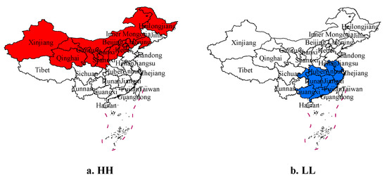 As Figure 4a shows, the Beijing, Hebei, Shannxi, Henan, Shangdong, Jiangsu, Zhang and Shanghai and Xinjiang provinces form a high-high agglomeration area (denoted as HH) for gas consumption. In contrast, the Yunnan, Guangxi and Hunan provinces form a low-low gathering area, denoted as LL. Xinjiang, Sichuan and Guangdong have high gas consumption, thus forming a high-low agglomeration area (denoted as HL) with the surrounding provinces, while Gansu and Anhui provinces (which have low gas consumption) form a low-high agglomeration with the surrounding provinces.
