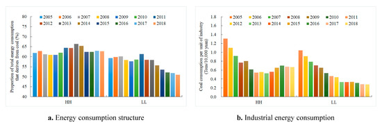 Furthermore, the energy consumption and industrial energy consumption structures of the provinces in the HH and LL regions are observed to exploit the difference in the effects of environmental regulation policies on natural gas consumption between these two regions, as shown in Figure 6.