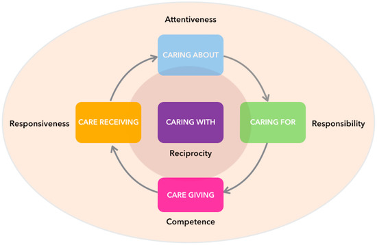 Following the model outlined by Tronto [15], caring is expressed in two ways: by means of ethical principles and through embodied practices. She captured this duality in the five stages of the caring process, with each stage represented by a practice that is motivated and activated by a moral principle. A visual representation of the five stages is provided in Figure 1.
