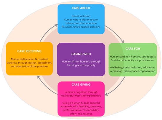 As summarized in Figure 4 (see Section 4), our analytical investigation across Tronto’s five stages of caring has revealed the following findings: (1) Practitioners are attentive to several issues that go beyond human health and well-being. They care about social inclusion, not only as the empowerment of vulnerable groups, but also as societal access to green environments. They are concerned about human–nature disconnection and, in particular, the two farms fear urban–rural disconnection. Finally, they are all passionate about working in a green environment and protecting nature. (2) Their attentiveness to such concerns and needs manifests itself in the daily practices they engage in and which go beyond the services they are most known for by their networks of stakeholders. They actually include a wealth of “invisible” activities (Fut-workshops), such as community building and outreach, awareness-raising, education and training, biodiversity regeneration, and appreciation of local traditions and livelihoods. Such activities are not exclusively directed to their target users; rather, they are rooted in context-dependent collective interests, tied to the needs of the places in which they are embedded, and thus benefit both the wider community and ecosystem. (3) Practitioners’ commitment to heal, empower, and regenerate people through practices of caring is not only expressed in what they do, but also how they do it. Core ingredients of high quality Green Care services appear to be nature, togetherness, and meaningful work and experiences. Human- and goal-oriented approaches characterize the ways of working, following criteria of flexibility, slowness, professionalism, responsibility, safety, and respect. (4) Both providers and customers of care activities are considered and respected as active agents. Practices are characterized by deliberation and tinkering. This is possible by designing services in a way that fits the capacities and aspirations of participants, implementing formal and informal mechanisms of assessment of the practices, and being open to constant adaptation. (5) The data reveal that learning is an essential element in all three cases. Green Care practitioners value learning deeply, for themselves as persons and professionals and for those they engage with. In the spirit of reciprocity, processes of learning also include the wider community beyond the target users. Reciprocity is a trait of human and non-human relations in these Green Care practices. Practitioners value the interdependence of human and ecosystem well-being and recognize non-human beings as sentient participants in the caring process.