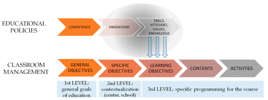 However, these two spheres—educational policies aimed at raising competences and curriculums designed for the classroom—are difficult to reconcile in practice (Figure 1). On the one hand, competence is most often used as a (rather bold) declaration of intent, which is only expressed in general terms without a specific definition of the intervening elements (knowledge, skills, values, attitudes) (Arnold, 1997, in [6]), associated with a vague definition of methodological notes and didactical notions. On the other hand, teachers (as designers of learning situations and architects of the teaching–learning process) require tangible or concrete entities on which to base the processes. As such, the open definition of competences in curricular design is a barrier to their practical implementation.
