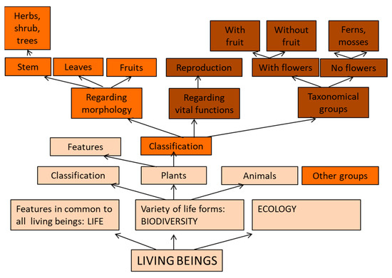 A nested hierarchy of factual concepts (contents of science; knowledge progression). An example of the classification of plants. Colors by grade: grades 1–2 (light); grades 3–4 (medium); grades 5–6 (dark orange).