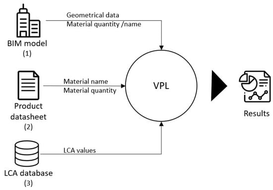 Figure 1. The schematic diagram shows the different data sources that are linked to the VPL. Specifically, information from the BIM model (1), the product datasheets (2), and the LCA database (3) are combined in the VPL environment where the impact is calculated, and the results are exported in the desired format.