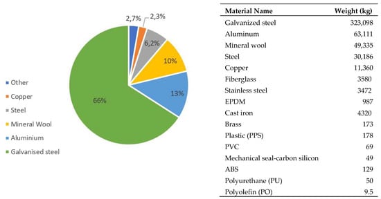 42] is an LCA dataset provided by the Swiss Conference of the Construction and Real Estate Organs of Public Builders (KBOB) for typical building materials in Switzerland, and it is based on Ecoinvent. The linking of the LCA values for the calculation of the embodied carbon is based on material mapping. The reason why material-based mapping is used is twofold; first, the case study model consists of around 60,000 elements. The complexity of these elements varies widely as well as the number of materials that they are composed of. In many cases, mainly mechanical equipment and air terminals, this information was not available in the provided model, and the material information had to be retrieved from the producers and inputted manually in an Excel file. Second, the LCA databases still lack a great deal of product-specific data for construction products. Thus, in many cases, similar materials must be used instead of the actual ones, ending up with 16 materials that describe the whole HVAC systems model.