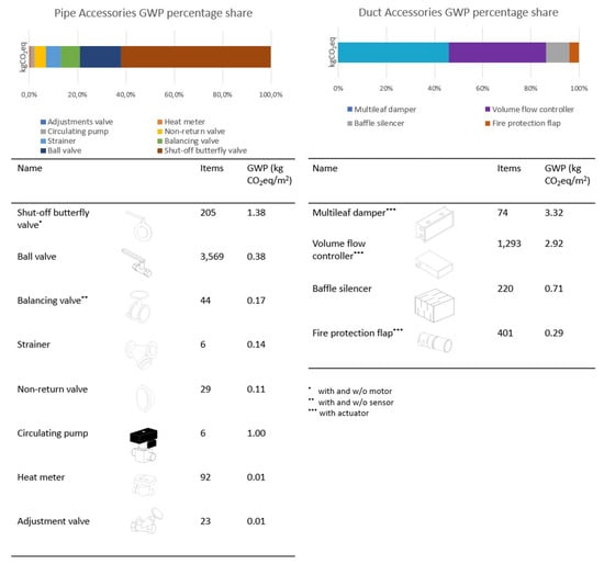 Pipe and duct accessories refers to all components that control air and water flow and pressure, such as valves and dampers. Most of these elements have a mechanical device (meter, actuator, sensor) that is operating the equipment. Like the mechanical equipment and the air terminals, these components require information from the manufacturers, or the information should be included in the BIM object. Control devices and meters contain materials such as solder alloys, TBBA, and FR-4, which are mainly part of the printed circuit boards (PCB) that cannot be found in the existing LCA databases. Therefore, they are calculated based on primary materials such as steel and brass.