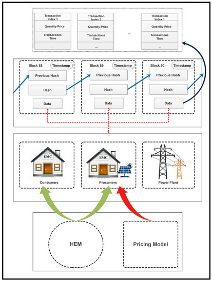 The authors in Reference [20] attempted to provide a decentralize and secure transaction using blockchain technology in the smart grid. In the research, participants anonymously negotiate the trading price and perform secure transactions using anonymous, encrypted messaging streams and multi-signatures. The proposed work is different from this research work by willingly allowing or encouraging all prosumers to become sellers and self-sufficient consumers in peak hours of energy generation. Similarly, in Reference [21], the authors proposed a system of distributed energy trading to encourage P2P sharing of electricity between prosumers. There are two layers in the proposed model. In the first layer, the agent coalition mechanism is proposed to allow prosumers to establish a coalition and to negotiate energy trading. A blockchain-based settlement of transactions is proposed in the second layer. A distributed approach to control Demand Response (DR) systems in a smart grid context is proposed in Reference [22]. The elements of the grid are integrated with the smart contract’s blockchain framework to ensure the verification of DR agreements, the programmatic definition of expected energy flexibility levels, the balance within production and demand of energy, and the validation of DR agreements. In Reference [23], Thakur et al. presented a distributed, scalable, and secure blockchain-based network for coalition structure creation and microgrid energy trading. However, the determination of the trading price between the parties is difficult to reach via negotiation. Similarly, the research work in Reference [24] aimed to provide an energy trading model that will facilitate a sustainable transaction of energy ecosystems among smart homes’ consumers and prosumers. However, energy and profit optimizations are not considered.