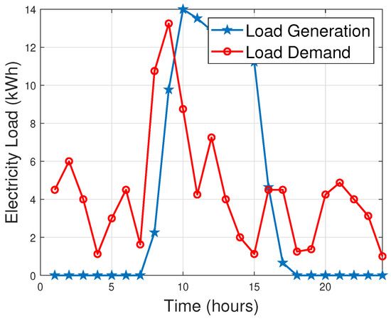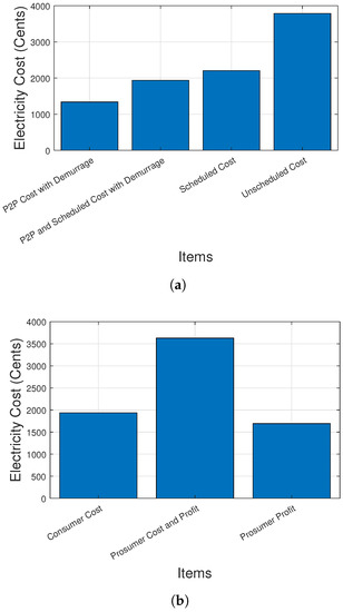 In our scenario, the demurrage mechanism will be triggered whenever the prosumer or consumer hoards energy or delays to buy energy within peak power generation periods. In this case, the condition of the given will be slightly different, i.e., the buying price will be slightly higher and the selling price will be slightly lower than the utility grid’s buying and selling price. This is to encourage participants to patronize local energy generated at on-peak hours, while at peak power generation, the prices obey the SDR pricing model. When , both the buying and selling power in the neighborhood are the same and no power is needed to import from or export to the utility grid. Also, both selling price and buying price are equal to the utility grid selling price, along with the compensation price . When , this means that there is no selling power in the neighborhood. All customers must buy energy from the main grid with a grid price of . Therefore, the buying and selling prices are equal to the main grid’s buying price . The compensation price is introduced to compensate the prosumer to ensure that all prosumers are better remunerated when participating in local energy trading. It also ensures that the selling and buying prices are not the same when , and it provides more economic benefits to the prosumers than the consumers. The buying and selling prices will variably change based on Equations (11) and (12), when . Figure 4 shows the relationship between and the proposed buying or selling prices. The figure shows that is reduced when power consumption increases. An increase in decreases both the selling and buying prices and vice versa. To increase the selling price, the participants must increase their energy consumption and the buyer would also need to decrease their energy consumption for a lower buying price.