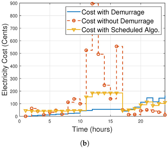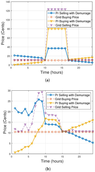 In order to discourage energy hoarders and to encourage consumers to purchase energy at peak power generation hours, we introduce a demurrage mechanism in prosumer buying and selling prices [39]. Let be the demurrage value as represented in Equations (13) and (14). The new buying and selling prices are and , which are derived from the demurrage mechanism and are represented in Equations (15) and (16), while Equation (17) represents the combination of buying and selling price with demurrage:
