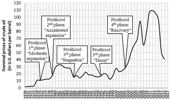 Proálcool phases and oil prices, 1970‒2016. Sources: OPEC [,,], Moraes et al. [].