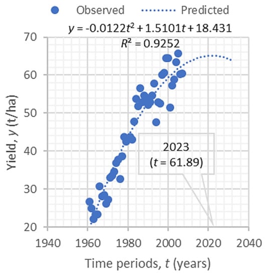 This is a necessary step to estimate yield functions (Table 2) over time (Equation (1)) and with respect to the area harvested of sugar cane (Equation (2)). Provided that the time and level of the maximum yield can be determined, it is possible to estimate how much land is needed and when for sugar cane crops to reach their maximum productivity (and output), either to produce food (sugar) or biofuel (ethanol) (Figure 1 and Figure 2). Beyond this point, productivity levels will go down, and hence any additional use of agricultural land is economically inefficient and ecologically ineffective. If all this additional land is used for bioenergy production, the bioeconomy, in this case, will lead to an unsustainable crop intensification (land grabbing). Finally, the roots of the yield function with respect to time estimate the years when productivity levels were (1961 − 11.2 ≈ 1950) and will be (1961 + 135 = 2096) zero.