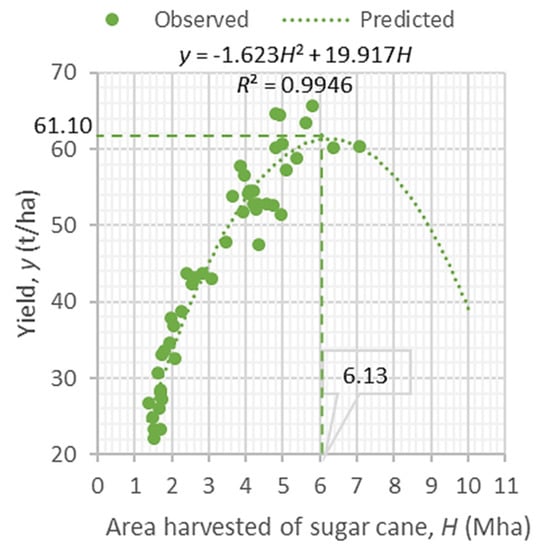 Sugarcane production has traditionally been split into sugar (food) and ethanol (fuel) production. The yields of both sugar and ethanol crops were similar and thus were merged in the analysis (Equations (1) and (2)). A detailed description of the methodology and data used is given in the Appendix A. The yields (y) of sugar and ethanol crops were regressed against time (t) and the area of sugarcane harvested (H), as illustrated in Figure 2 and Figure 3. As these figures show, the yields of both sugar and ethanol production will reach a maximum potential of 61.10 t/ha by the year 2023. From this peak onwards, yields are expected to fall (Table 2). The years 1950 and 2096 are the “zeroes” (roots) of the estimated quadratic function for the yield as a function of time. When we set the yield to zero in Equation (1) (Figure 1), we get the years when the yields were (1950) and will be (2096) null. Of course, none of these years falls within the scope of this analysis. Rather, they are just shown as reference points. For the production of either sugar or ethanol, the maximum output (374.57 Mt) would be collected from a harvest area no larger than 6.13 Mha (Table 2). Assuming that both commodities will be continuously produced, 12.26 Mha would be needed, which corresponds to about one-fifth of the fertile land (65 Mha) in the Cerrado area []. The maximum yield of sugarcane for ethanol or sugar will be achieved in 2023 (61.1 tons per hectare). From that year onwards, standard production and the Proálcool program, regardless of yield decrease, are expected to continue under Brazil’s bioeconomy policy. This evidence goes along with the hypothesis that land grabbing is positively correlated with bioeconomic development. Therefore, the continuous expansion of the land area devoted to sugarcane seems to be economically inefficient. This shows that extensive processes of land grabbing, instead of sustainable intensification practices, are occurring and will occur in the near future.