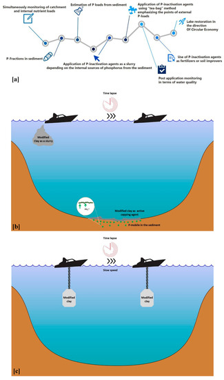 The aforementioned effects are also mediated by the thickness of deposition and the intensity and frequency of deposition events. Many species are adapted to re-surface from thin deposits, but the intense deposition events are considered a substantial burden on the ecosystem. Therefore, the application process of P-inactivation agents in a natural and dynamic ecosystem requires careful consideration (Figure 9a). The necessary quantities of material utilized in the form of slurry should be accurately calculated, being based on the potentially bioavailable mobile P of the sediment in the water column (Figure 9b) [45,49,50,51] present in the water column and its external flows can be adsorbed by the proposed method of “tea-bag” (Figure 9c,d).