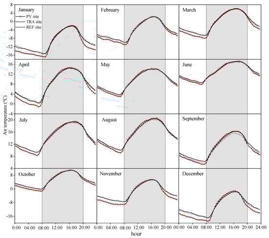 Figure 2 shows the monthly average diurnal variations in 2.5 m air temperature at the PV, TRA, and REF sites. The temperature of the three monitoring sites was minimum at approximately 8:00 and maximum at approximately 16:30. Depending on the season, the maximum or minimum value occurred slightly earlier or later. The average annual temperatures at the PV, TRA, and REF sites were 3.54, 4.07, and 4.10 °C, respectively. The temperatures at the PV site were 0.53 and 0.56 °C lower than those at the TRA and REF sites, respectively. The temperatures at the three monitoring sites tended to be the same during the day (shaded part in Figure 2) but were significantly different at night.