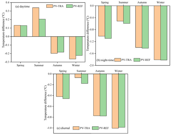 Since the main working hours of the Gonghe PV Power Plant are during the day, there were significant differences in day and night temperatures. The temperatures were divided into daytime and night-time temperatures for discussion. The daytime temperature is the average of temperatures measured between 08:00 and 20:00 local time. The night-time temperature is the average of temperatures measured between 21:00 and 07:00 local time. The average diurnal temperature is the average of temperatures measured during the same day (24 h). Figure 3 compares the variations in the difference between the average daytime, night-time, and diurnal temperatures at the PV, TRA, and REF sites. The PV power plant had a warming effect during the day in spring and summer. The temperature difference between different monitoring sites was larger in summer than in spring, and the average daytime temperature at the PV site in summer was 0.34 and 0.20 °C higher than those at the TRA and REF sites, respectively. This greater impact of the PV power plant on the ambient temperature in summer might be due to the higher solar radiation intensity in the desert and the longer operating time of the PV power plant in summer. The PV power plant had a cooling effect during the day in autumn and winter, and the cooling effect was more prominent in winter than in autumn. The average daytime temperature at the PV site was 0.26 and 0.22 °C lower than those at the TRA and REF sites, respectively, in winter.