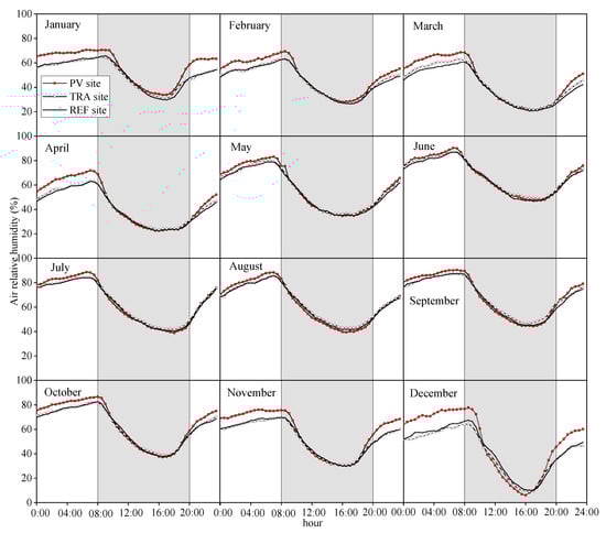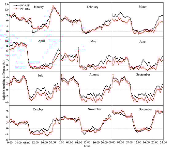 The comparison of the monthly average diurnal variation in the difference in relative humidity inside and outside the PV power plant is shown in Figure 5. When the daytime temperature was high, the relative humidity at the PV site was lower than those at the TRA and REF sites (except in January), indicating that the PV power plant had a dehumidification effect, but the dehumidification range is small. At night, the relative humidity at the PV site was significantly higher than those at the TRA and REF sites, indicating that the PV power plant had a significant humidification effect.