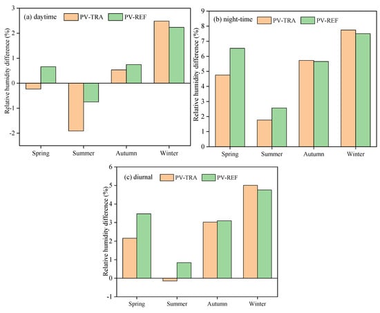 The comparison of the seasonal variation in the difference in relative humidity inside and outside the PV power plant is shown in Figure 6. The PV power plant had a dehumidification effect during the day in summer, and the daytime relative humidity at the PV site was 1.91% and 0.75% lower than those at the TRA and REF sites, respectively. This result indicated that the closer the monitoring site was to the center of the PV power plant, the more significant the relative humidity decrease was at the monitoring site during the day in summer. In autumn and winter, the PV power plant had a humidification effect during the day. The daytime humidification effect at the PV site was more significant in winter than in autumn, and the daytime relative humidity at the PV site in winter was 2.48% and 2.24% higher than those at the TRA and REF sites, respectively. In spring, the daytime relative humidity at the PV site was lower than that at the TRA site and higher than that at the REF site. At night, the PV power plant had a humidification effect in all seasons. The humidification effect at night at the PV site was smallest in summer, and the night-time relative humidity at the PV site in summer was 1.77% and 2.57% higher than those at the TRA and REF sites, respectively. The humidification effect at night at the PV site was largest in winter; the night-time relative humidity at the PV site in winter was 7.75% and 7.50% higher than those at the TRA and REF sites, respectively. In general, the PV power plant had a humidification effect in all seasons (except for summer, during which the relative humidity at the PV site was 0.15% lower than that at the TRA site). The humidification effect of the PV power plant was the most significant in winter, and the relative humidity at the PV site was 5.00% and 4.76% higher than those at the TRA and REF sites, respectively.