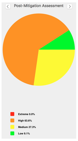 Chart 8 depicts that after the mitigation solutions have been theoretically applied shops/restaurants have high, medium, and low risks associated with them. The chance of a highly severe risk occurring is 63.6%, a medium severity risk occurring is 27.3%, and there is still a 9.1% chance that a low severity risk will occur.