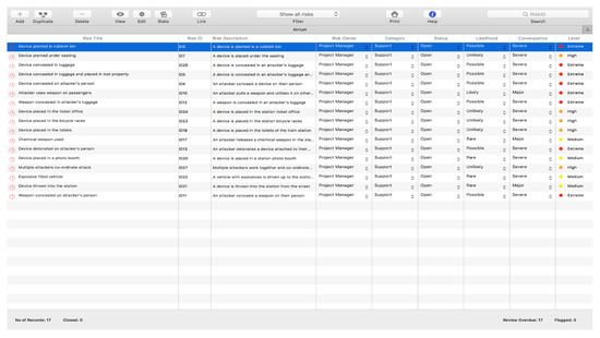 This study explores the use of the Risk Manager application software to examine different areas of train stations and their infrastructure through individual location risk assessments. The purpose of this software and how it is utilised serve to evaluate the effectiveness of mitigation solutions on a rudimentary basis. The software allows for numerous risks to be input into a single database (Figure 1). Within individual edit windows, the properties of each risk are then defined more extensively, including the risk identification, the pre-mitigation assessment, the risk mitigation and post-mitigation assessment details (Figure 2). Outcomes of the assessments are displayed in charts depicting the probability of attacks colour-coded according to increasing severity risk, should it occur, and displaying the percentage likelihood that an attack of this severity would occur. The mitigation strategies that could be adopted to lessen or eliminate the possibility of attack are then theoretically utilised, and the revised assessment charts are generated to provide a visual comparison and percentage analysis of residual risk severity after the mitigation solutions have been applied to assess their effectiveness.