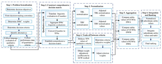 The procedure of the Z-number based double normalization-based multiple aggregation (Z-DNMA) method. “TBL: Target-based linear; TBV: Target-based vector; GCW: Gini coefficient-based weighting; OWA: Weighted average operator; OWM: Weighted maximum operator; OWG: Weighted geometric operator”.