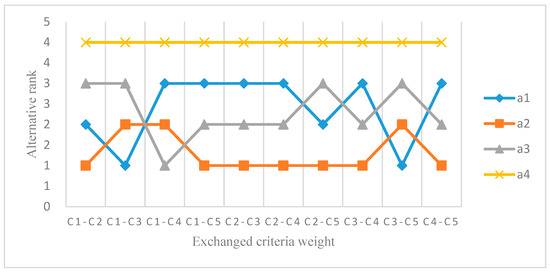 First, we adopt a weight replacement strategy for sensitivity test. Figure 2 contains the ten different tests to exchange the subjective weights of criteria and demonstrates the corresponding ranks of alternatives. For example, - denote that the subjective weights of criteria and criteria have been interchanged. From Figure 2, it is clear that has the highest rank in seven out of ten weighted calculation experiments, and has the lowest rank in all experiments. This suggests that the optimal and worst CSPs have not altered in most cases, which illustrates the stability of the ranking results.